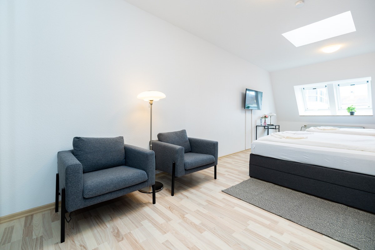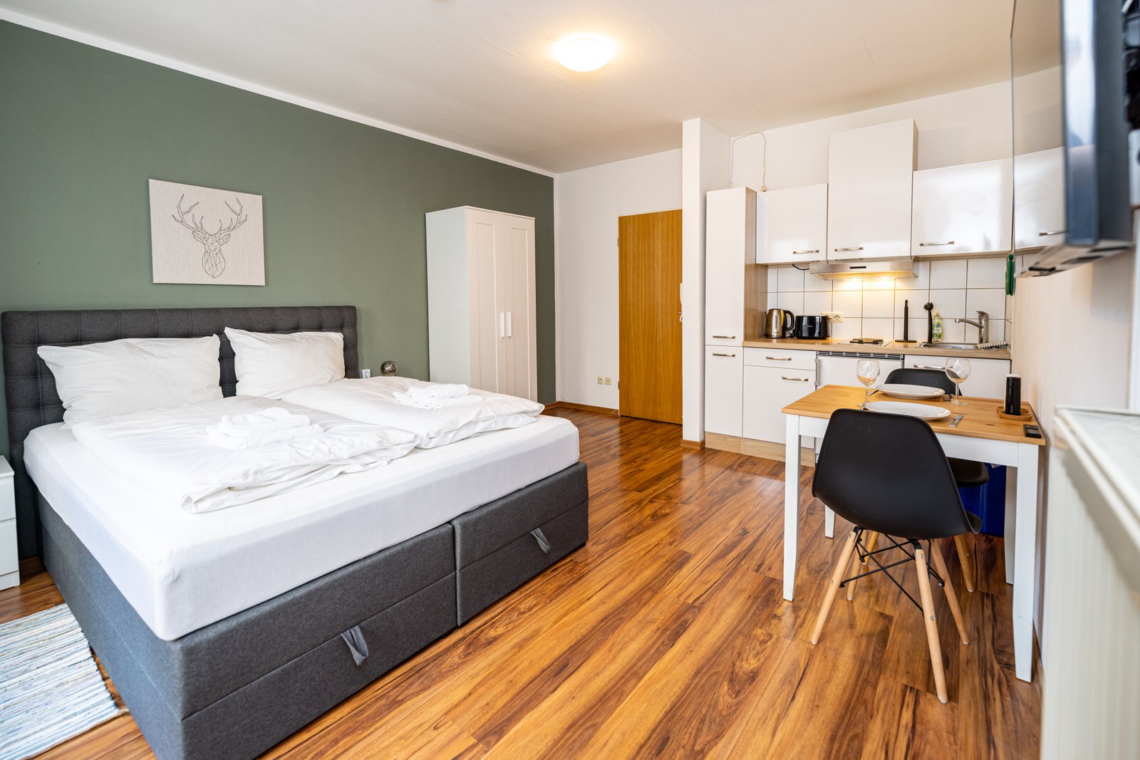 Die Grö­ßen der Woh­nun­gen rei­chen von ca. 23 bis 44 Qua­drat­me­ter und spre­chen damit sowohl Kurz­zeit­mie­ter als auch klas­si­sche Ein­zel­mie­ter an. Eine Ein­heit ver­fügt über einen Duplex‑, eine ande­re über einen Außen­stell­platz, was die Ver­miet­bar­keit zusätz­lich stärkt.