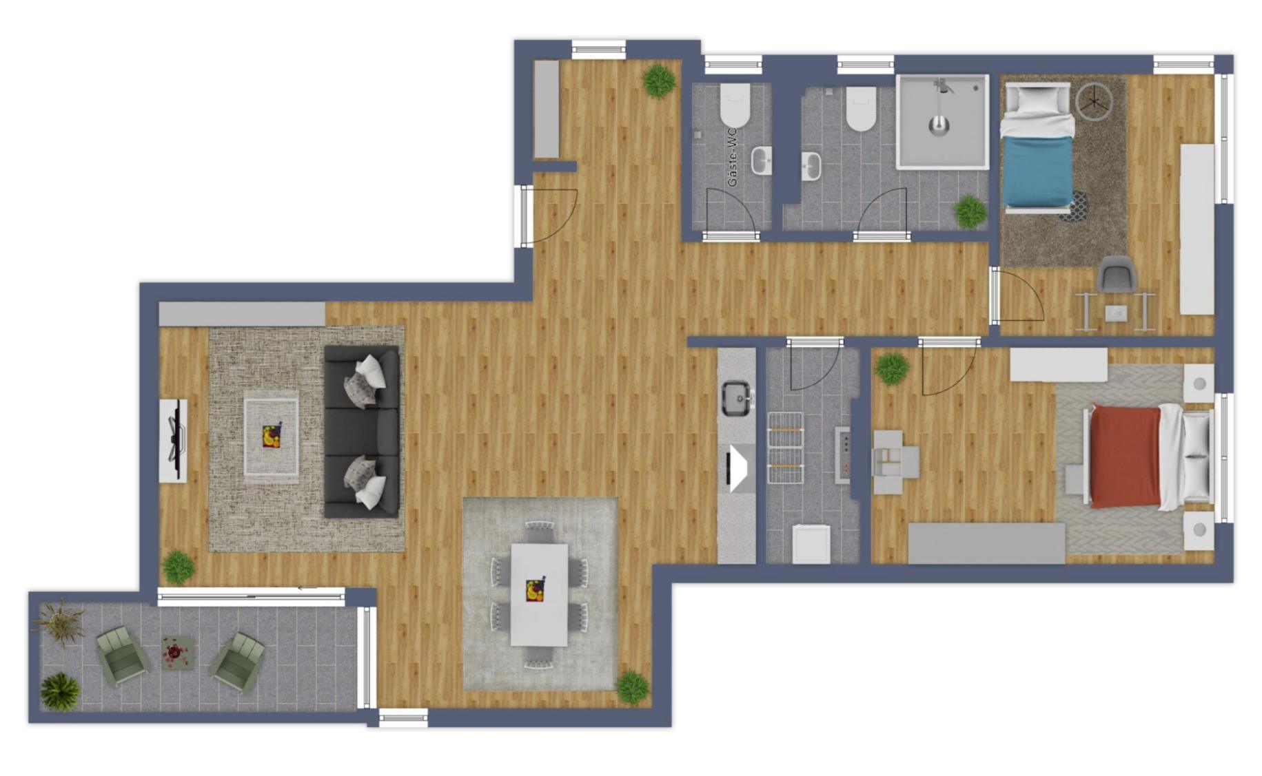 Die bei­den Schlaf­zim­mer bie­ten viel­fäl­ti­ge Ein­rich­tungs­mög­lich­kei­ten – sei es für Rück­zug, Arbei­ten oder als Kin­der­zim­mer. Das modern gestal­te­te Tages­licht­bad ist mit einer boden­glei­chen Dusche ver­se­hen. Zusätz­lich gibt es ein Gäs­te-WC. Für all­täg­li­che Orga­ni­sa­ti­on sorgt ein prak­ti­scher Abstell­raum inner­halb der Woh­nung, in dem sich zudem der Wasch­ma­schi­nen­an­schluss befin­det – platz­spa­rend und kom­for­ta­bel inte­griert.