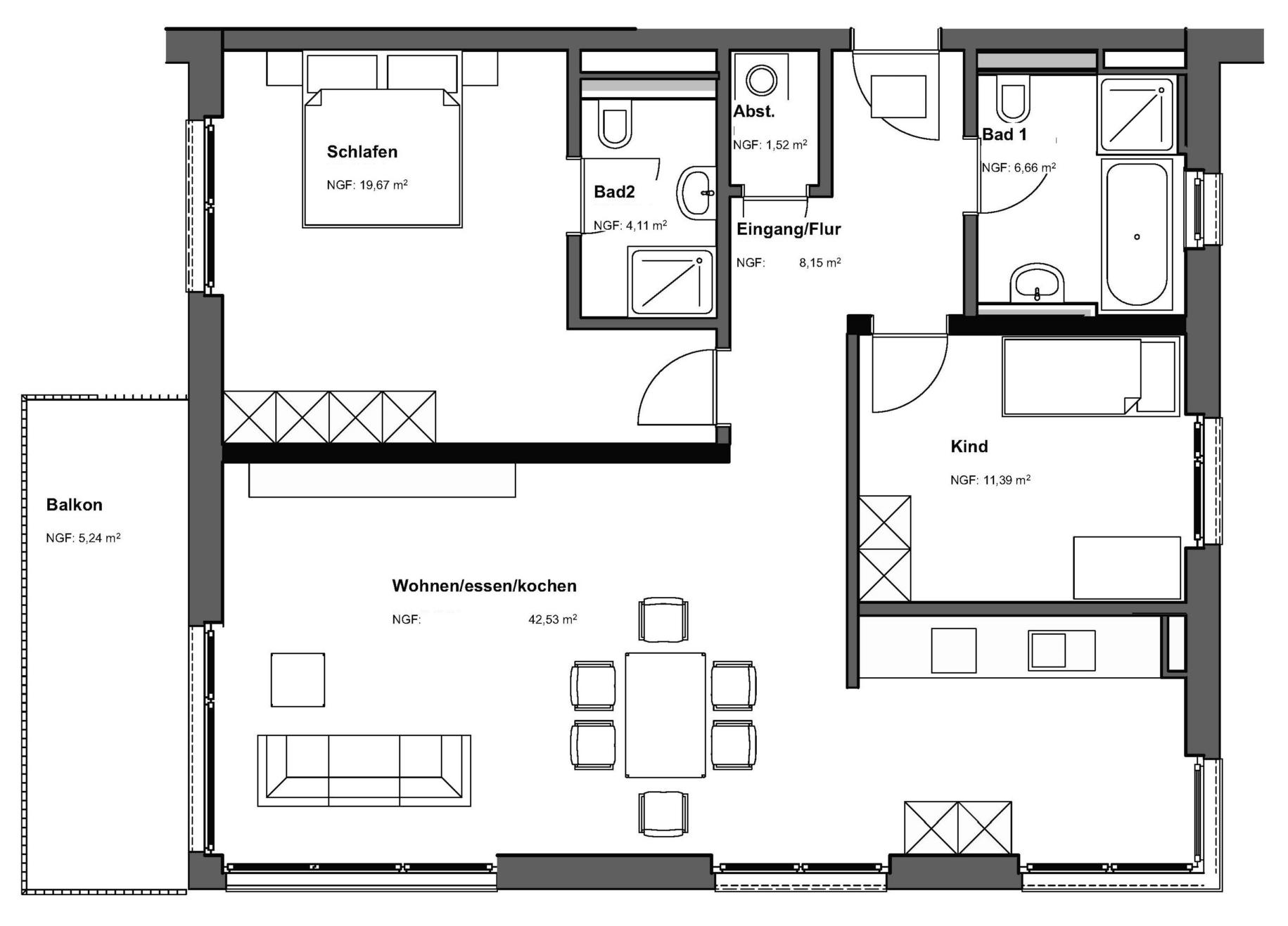 Die Wohnung bietet mit ihrem klaren Schnitt, den hochwertigen Materialien und der cleveren Raumaufteilung ein Zuhause mit zeitlosem Wert – eine Kombination, die sowohl heute als auch in Zukunft überzeugt. Ideal für Menschen, die sich Wohnqualität, Komfort und Energieeffizienz gleichermaßen wünschen. Zudem ist der Zugang zur Wohnung und zu den Aufzügen barrierefrei.
