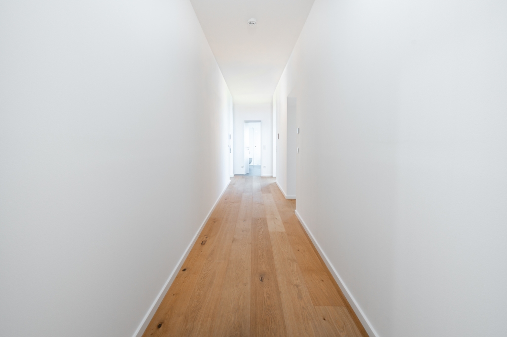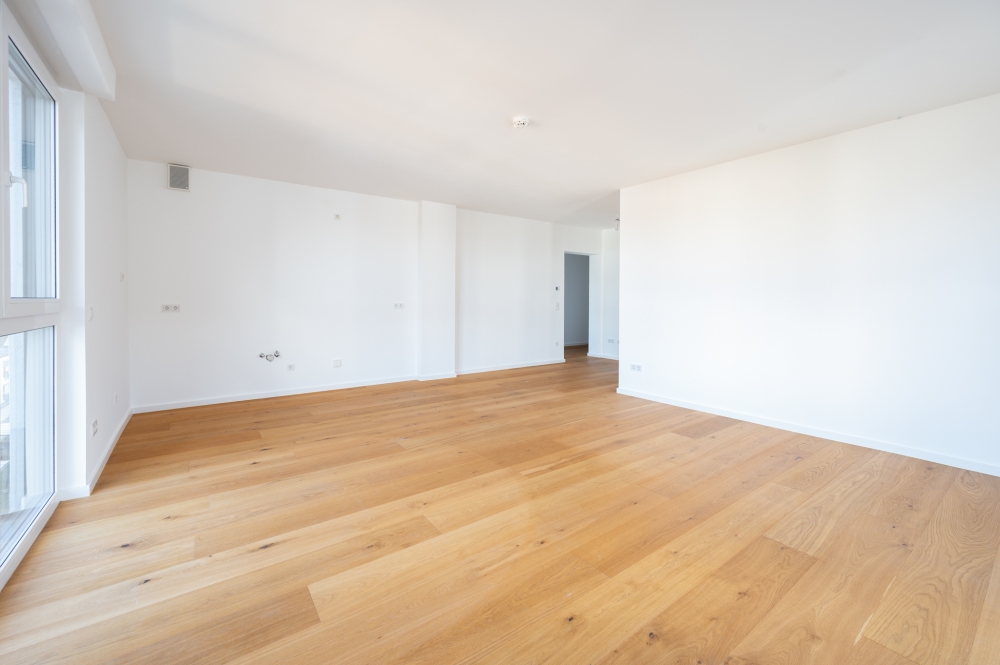 Herzstück der Wohnung ist der großzügige, rund 35 m² große Wohn‑, Koch- und Essbereich, der viel Raum für gemeinsames Wohnen und Leben bietet. Der Aufzug hält direkt in der Wohnung und führt in einen einladenden Eingangsbereich mit ausreichend Platz für eine Garderobe.
