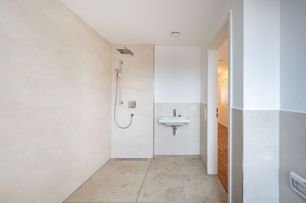 Das Gebäude ist stufenlos erschlossen und verfügt über einen Personenaufzug, der alle Ebenen miteinander verbindet. Niedrigschwellen an Terrassen- und Zugängen erleichtern die Nutzung in unterschiedlichen Lebensphasen. Die Grundrissgestaltung der Bäder erlaubt bei Bedarf spätere Anpassungen.
