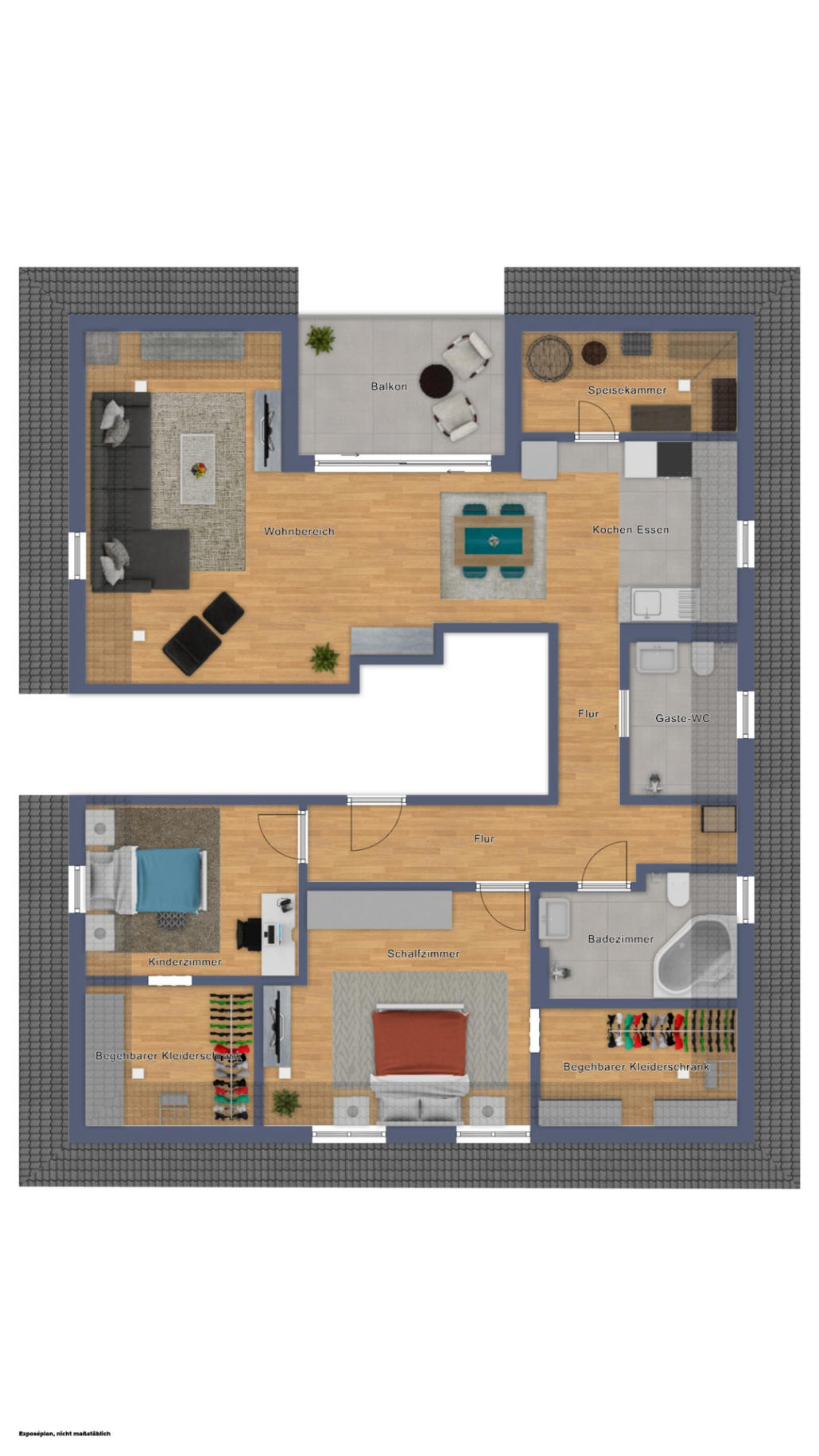 Im Mittelpunkt der Wohnung steht der große Wohn‑, Ess- und Kochbereich. Großflächige Fenster- und Türelemente sorgen für eine helle, offene Atmosphäre und schaffen eine fließende Verbindung zum südlich ausgerichteten Balkon. Hier entsteht ein zentraler Lebensraum mit angenehmer Weite und klarer Unterteilung zwischen Kochen, Essen und Wohnen.