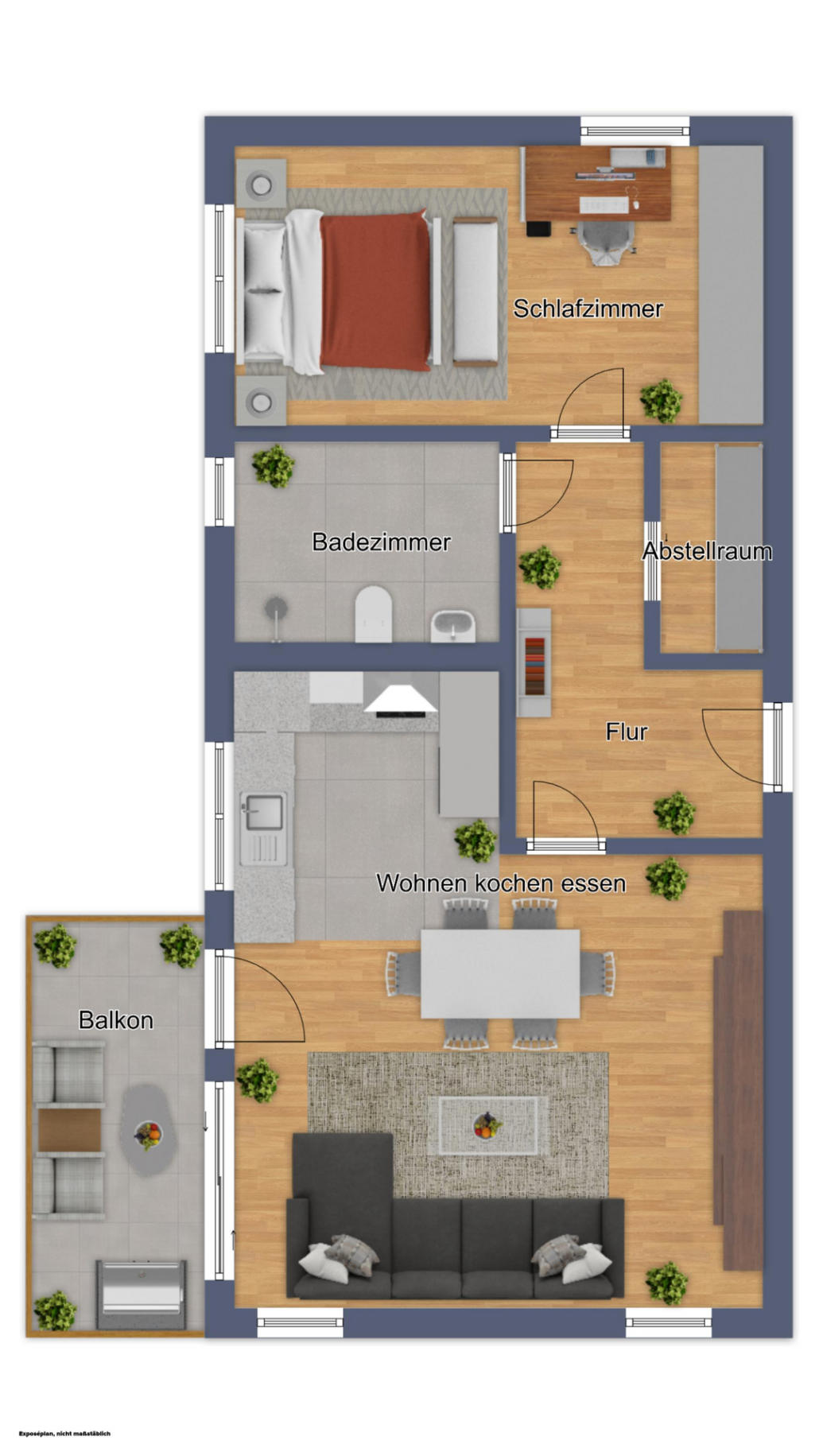 Im Mit­tel­punkt der Woh­nung steht der gro­ße Wohn‑, Ess- und Koch­be­reich. Groß­flä­chi­ge Fens­ter- und Tür­ele­men­te sor­gen für eine hel­le, offe­ne Atmo­sphä­re und schaf­fen eine flie­ßen­de Ver­bin­dung zur süd­öst­lich aus­ge­rich­te­ten Bal­kon. Hier ent­steht ein zen­tra­ler Lebens­raum mit ange­neh­mer Wei­te und kla­rer Unter­tei­lung zwi­schen Kochen, Essen und Woh­nen. Das ruhig gele­ge­ne Schlaf­zim­mer über­zeugt durch sei­nen kla­ren, funk­tio­na­len Grund­riss und bie­tet aus­rei­chend Platz für ein gro­ßes Dop­pel­bett sowie zusätz­li­che Möbel. Dank der groß­zü­gi­gen Fens­ter­flä­chen wird der Raum mit viel Tages­licht durch­flu­tet und schafft eine hel­le, ange­neh­me Wohnat­mo­sphä­re. Ein sepa­ra­ter Abstell­raum inner­halb der Woh­nung ergänzt die Funk­tio­na­li­tät sinn­voll.