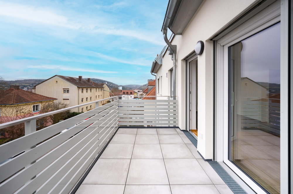 Der süd­öst­lich aus­ge­rich­te­te Bal­kon erwei­tert den Wohn­raum ins Freie und bie­tet ange­neh­me Vor­mit­tags- und Mit­tags­son­ne.