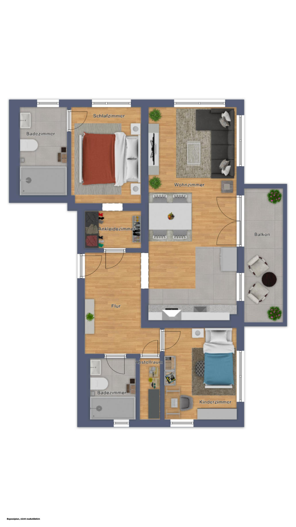 Das Haupt­schlaf­zim­mer ver­fügt über eine vor­ge­la­ger­te Anklei­de sowie ein eige­nes Tages­licht­bad mit boden­glei­cher Dusche. Die­ser pri­va­te Bereich ist bewusst sepa­riert und bie­tet ein hohes Maß an Kom­fort und Rück­zugs­mög­lich­keit. Ein wei­te­res Schlaf­zim­mer mit eige­nem Dusch­bad und Tages­licht eröff­net fle­xi­ble Nut­zungs­mög­lich­kei­ten – ob als Gäs­te­zim­mer, Büro oder zusätz­li­cher Wohn­raum. Ein sepa­ra­ter Abstell­raum inner­halb der Woh­nung ergänzt die Funk­tio­na­li­tät sinn­voll.